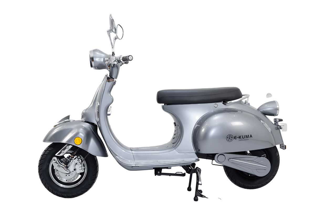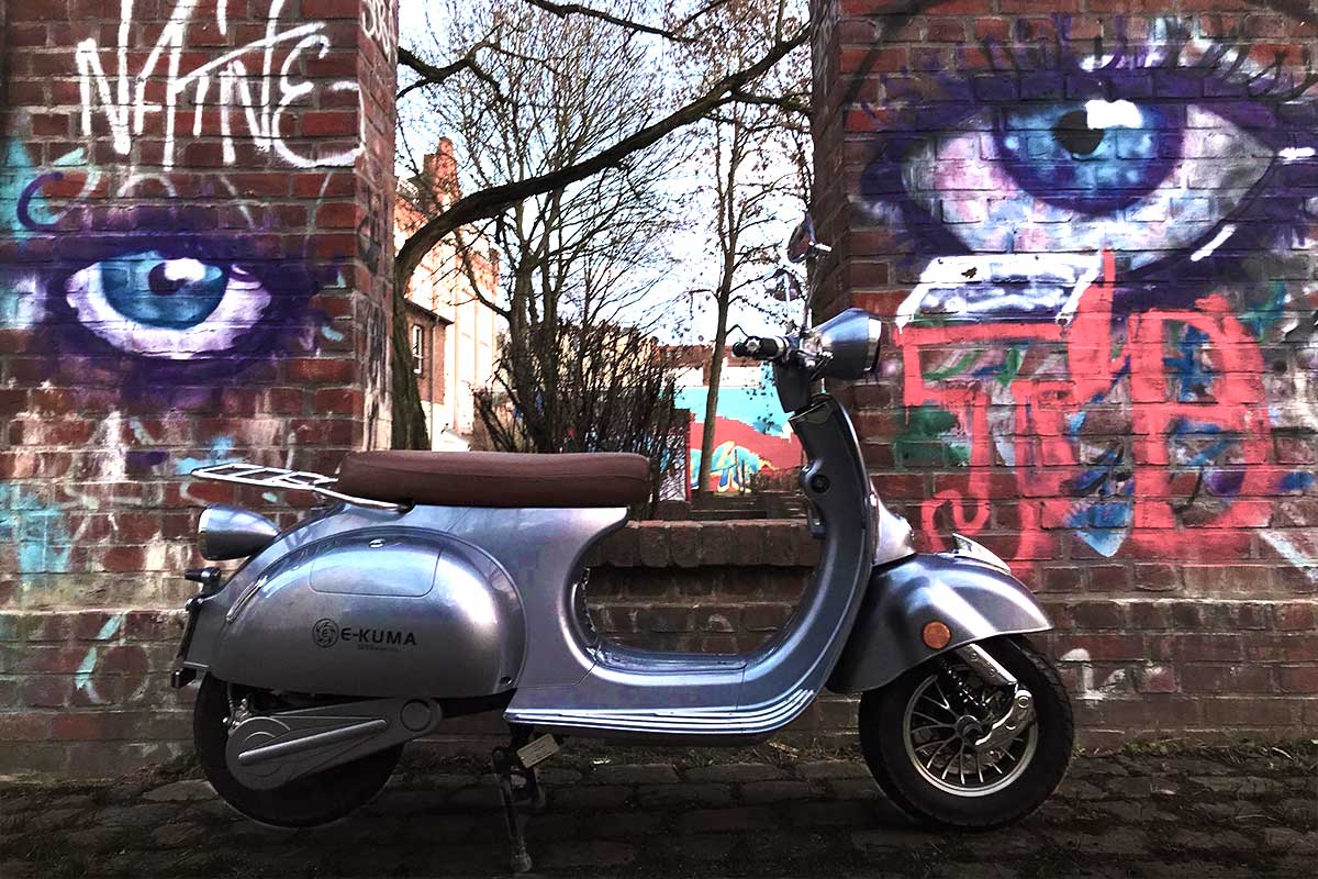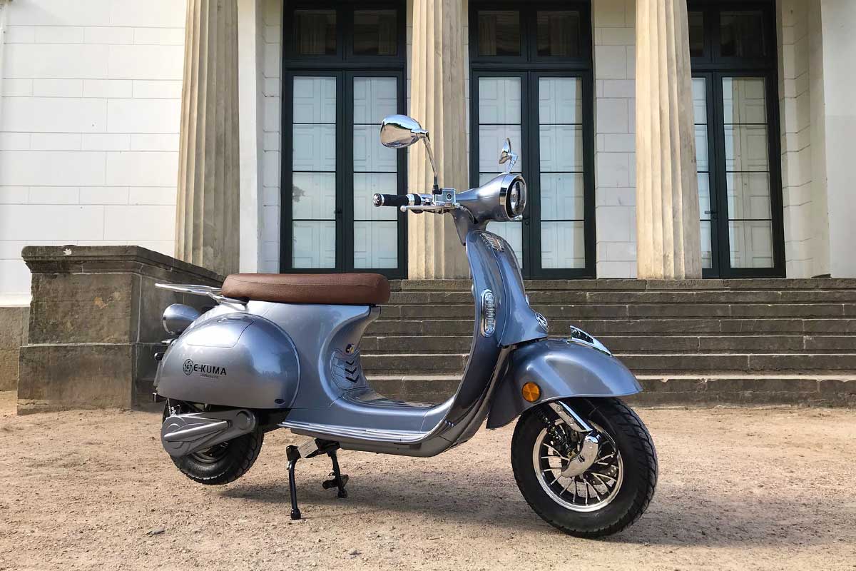Der e-kuma SKY 2000W sieht aus wie eine klassische Vespa aus den 50er Jahren. Er ist aus allen Blickwinkeln schön und macht immer eine gute Figur. Mehr dazu weiter unten.