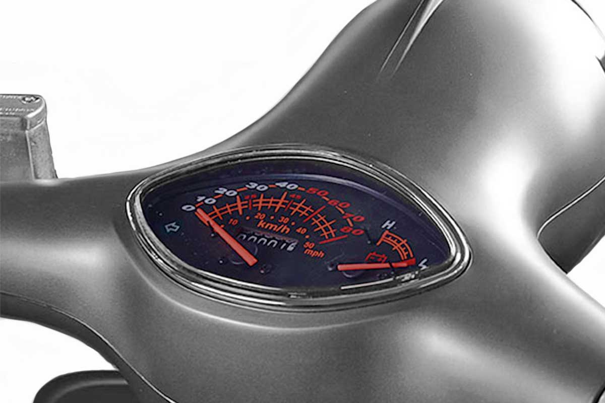 Wir schätzen sein schönes klassisches Vespa-50e-Jahre-Design, insbesondere in der Farbkombination grau mit brauner Sitzbank.