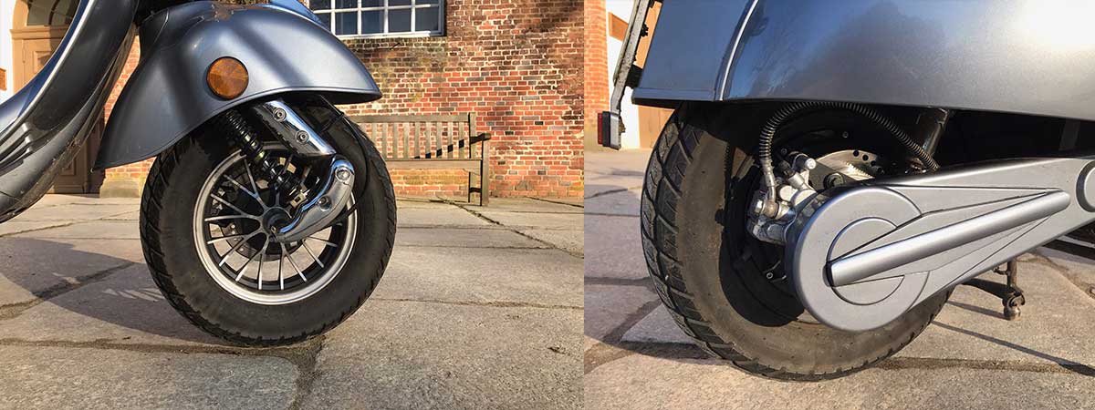 Der SKY 2000W fährt vorn und hinten auf 10-Zoll-Rädern, was sehr gut zu dem Roller passt, wie Du auf den Fotos sehen kannst..