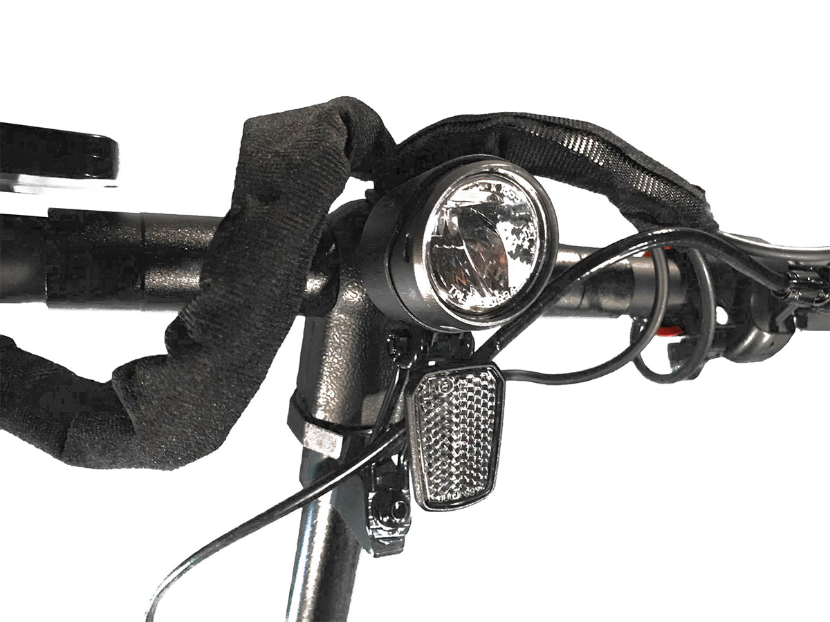 Die fordere LED-Beleuchtung ist nicht im Rahmen oder Lenker integriert, wie bei manchen anderen e-Scootern, sondern von außen so angebracht, dass Du die Höhe des Lichtkegels leicht verstellen und spontan an Deine Fahrt bei Dunkelheit anpassen kannst.